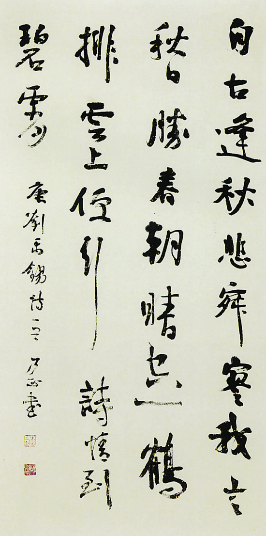 朱乃正 (中国)第十届全国政协委员。中央美术学院教授。中国美术家协会事理。行书·条幅 纸本 自古逢秋悲寂寥,我言秋日胜春朝。晴空一鹤排云上,便引诗情到碧霄。
