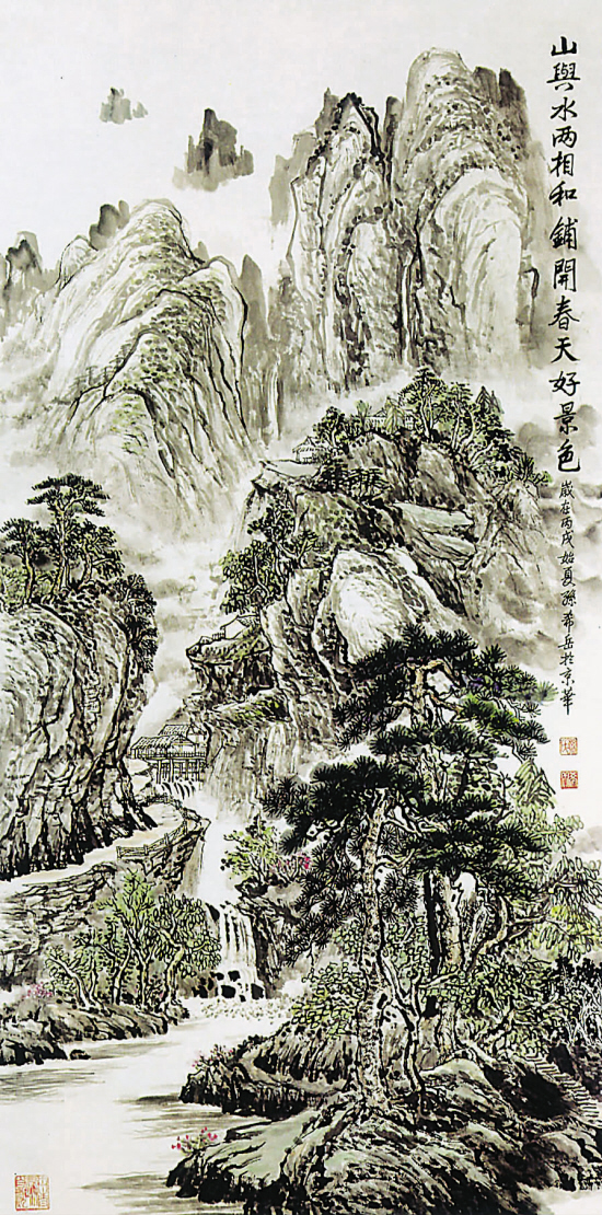 国画·立轴 纸本 山与水两相和 铺开春天好景色