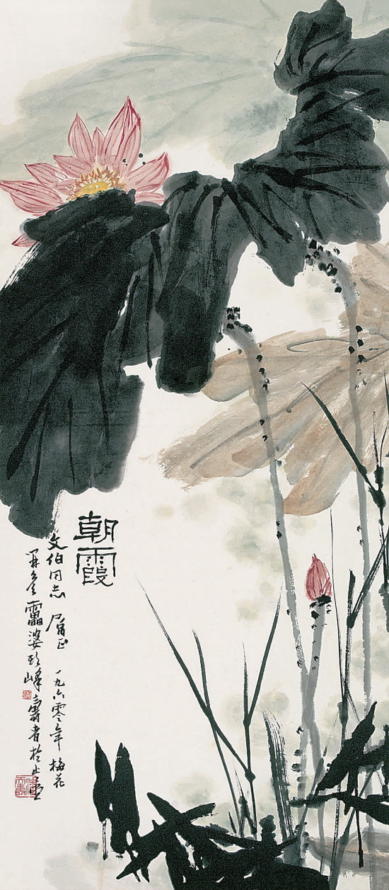 估价:1,200,000-1,500,000 说明:1、此图硕叶如盖,笔似斧劈,胆魄惊人;荷花茂美,娇艳欲滴,气旺神强;杂草枝干,穿插有致,坚如铁铸,诚是阿寿画荷精品。潘天寿流传画作罕见,此画在“文革”中曾特别指明为黑画,并一度流散,今之所获犹显难得。2、此画为魏文伯藏品,1978年由上海市文管会归还,家属珍藏至今。