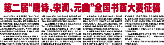在中国五千年的文化发展历程中,“唐诗”、“宋词”代表了中国古典诗歌的最高峰,而“元曲”则是中国古代诗歌的最后辉煌。李白的飘逸、潇洒,李清照的悲凉、凄婉,关汉卿的刚毅、傲然,无不为后人所向往、同情和敬慕。诗中的警句名篇被历代文人所吟诵,自唐诗、宋词、元曲之后,诗歌艺术“无出其右者”。为了更好地继承和发扬中华民族的诗词书画优秀传统文化,经有关方面批准,特举办这次大赛,现面向全国征稿。