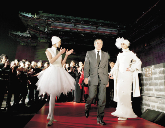 近日,“皮尔·卡丹07/08秋冬时装发布会”在北京东便门至崇文门的一段明城墙遗址上举行。皮尔·卡丹公司主设计师塞尔贾·阿尔铁里(前中)与模特一同登台谢幕。时尚与历史元素的结合使这场时装秀别具特色。 新华社记者 陈建力 摄