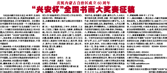 为纪念内蒙古自治区成立60周年,弘扬先进文化、谱写和谐社会、民族团结新篇章,由中国书画家联谊会、《中国书画家报》、兴安盟兴安书画院等单位在全国第一个少数民族自治区诞生地——被称作“红色的摇篮”(1947年5月1日内蒙古自治政府就在这里成立)的兴安盟(乌兰浩特市),联合举办庆祝内蒙古自治区成立60周年 “兴安杯”全国书画大奖赛。