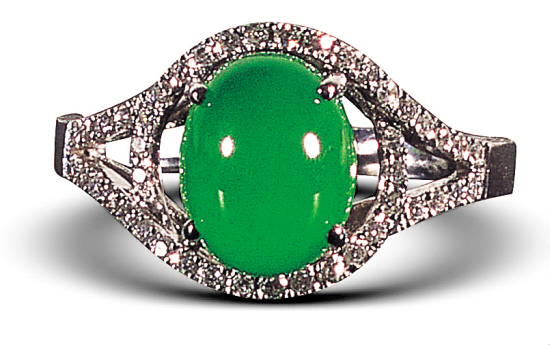 463 18k白金镶钻石椭圆形翡翠女戒 戒面翠色浓艳,品相饱满,质地细腻,通透润泽,设计文雅新颖。 戒面尺寸:0.7×0.9cm 估价:7000-12000