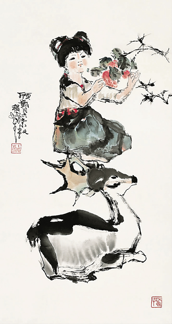 131 程十发 伺鹿图 设色纸本 镜片 98×52cm