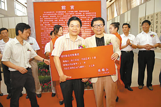 现代联合控股集团董事长章鹏飞(中立左)接受陈锡山赠书