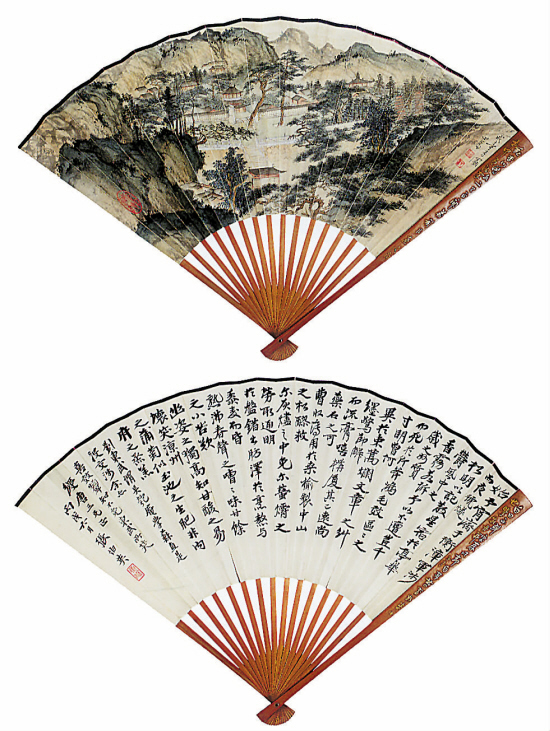 858 溥 儒、张伯英、戒台寺图、行书 设色绢本 成扇 估价:100000-180000