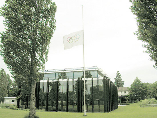 5月20日,瑞士洛桑国际奥委会总部前的五环旗降半旗向中国汶川大地震遇难者志哀。