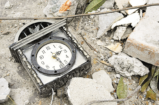 5月18日,汶川大地震灾区都江堰的一处废墟,一个时钟永远将时间定格在14时28分。陈燮 摄