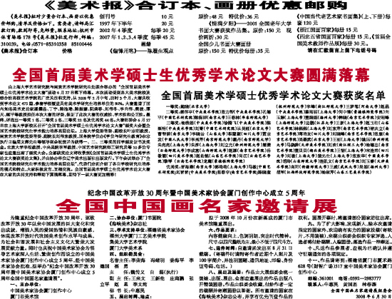 《美术报》拟对少量合订本、画册以优惠价邮购,清单及价格如下。需要者,请邮局汇款订购,款到即寄,免邮资。联系地址:杭州市体育场路178号《美术报》社发行部,邮编:310039。电话:0571-85310358 85100446