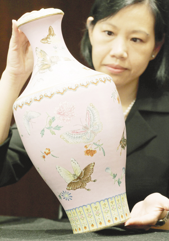 清乾隆御制粉红地粉彩轧道蝴蝶瓶