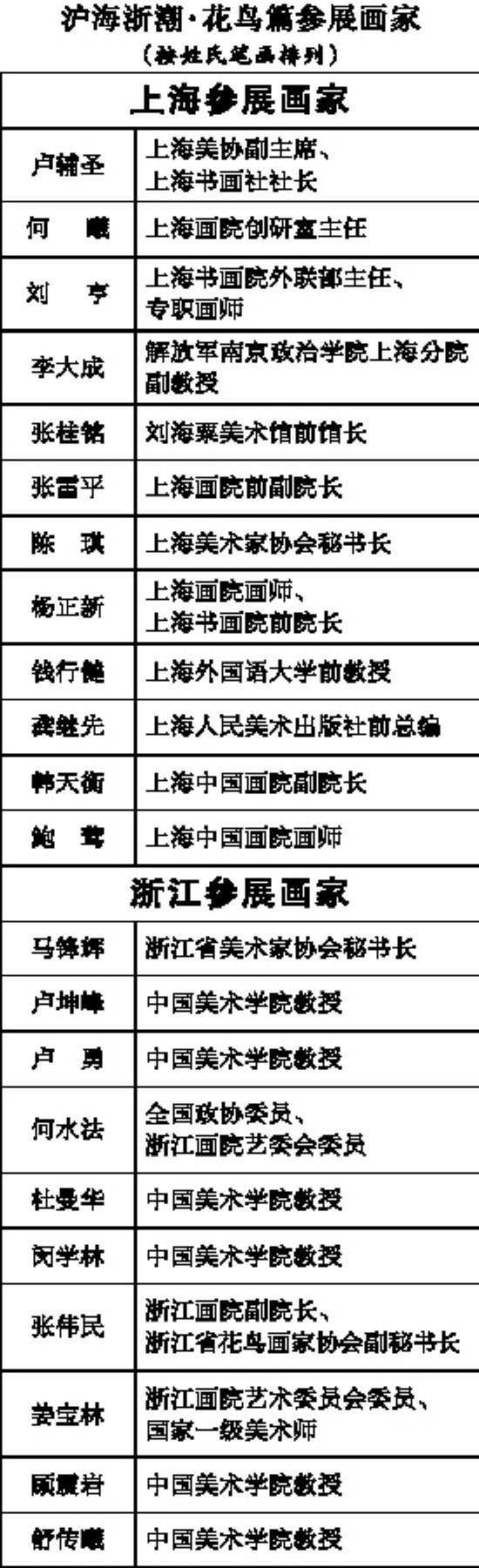 沪海浙潮·花鸟篇参展画家 (按姓氏笔画排列) 上海参展画家 卢辅圣 上海美协副主席、 上海书画社社长 何 曦 上海画院创研室主任 刘 亨 上海书画院外联部主任、 专职画师 李大成 解放军南京政治学院上海分院副教授 张桂铭 刘海粟美术馆前馆长 张雷平 上海画院前副院长 陈 琪 上海美术家协会秘书长 杨正新 上海画院画师、 上海书画院前院长 钱行健 上海外国语大学前教授 龚继先 上海人民美术出版社前总编 韩天衡 上海中国画院副院长 鲍 莺 上海中国画院画师 浙江参展画家 马锋辉 浙江省美术家协会秘书长 卢坤峰 中国美术学院教授 卢 勇 中国美术学院教授 何水法 全国政协委员、 浙江画院艺委会委员 杜曼华 中国美术学院教授 闵学林 中国美术学院教授 张伟民 浙江画院副院长、 浙江省花鸟画家协会副秘书长 姜宝林 浙江画院艺术委员会委员、 国家一级美术师 顾震岩 中国美术学院教授 舒传曦 中国美术学院教授 |