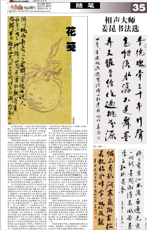 在花笺创作时,说是创作,其实是随心所欲的写字,在于有心与无心之间。给花笺配以相关的诗词、文章,虽说无意创作,但每幅笺画章法格局都不相同,在配写文字时,要注意书与画的搭配结合,空间的穿插,有些画面适宜多字,有的宜少,有的宜楷,有的宜草,努力使插入的文字能给画面添彩,不累赘,方不失为佳作。空暇时都要写上几幅,满意不满意都留下,作日课去书写,不以目的性去创作,深感越是这样越出佳作,写好便放入柜中,以后用时再去筛检。