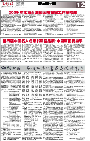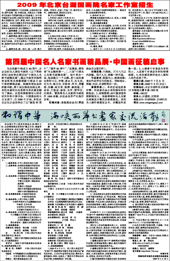1、2009年6月9日,在人民大会堂召开“和谐中华·海峡两岸书画艺术家交流活动”新闻发布会。正式对外宣布活动启动,将在各大新闻媒体、报纸、电视台、广播及官方网站发布活动详情,向海峡两岸广泛征稿。
