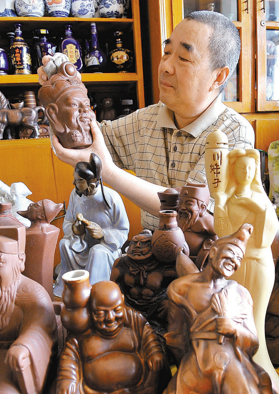 安徽滁州市六旬老人王金平,2003年开始热衷于收藏酒瓶。目前,王金平收藏了以陶瓷瓶为主的酒瓶约1500种,他也成为国内酒器收藏界的名人。