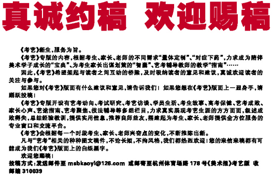 投稿方式:发送邮件至msbkaoyi@126.com 或邮寄至杭州体育场路178号《美术报》考艺版 收