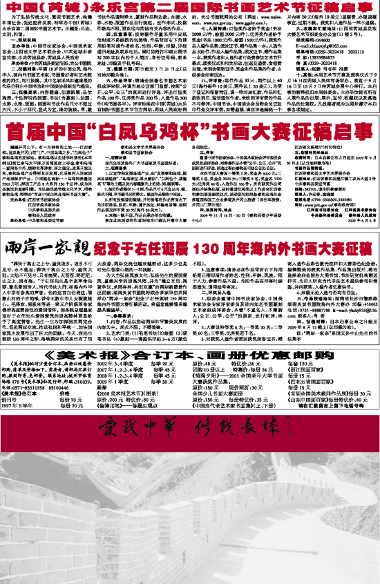 3、所有投稿请勿装裱,并用铅笔在作品背面右下角注明姓名、性别、年龄、通讯地址、邮编电话等,每幅作品须交评审费30元(海外30美元)。