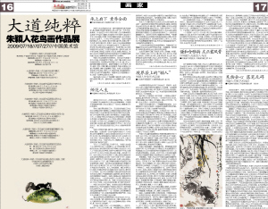 用笔精到。朱颖人先生对于中国花鸟画的笔墨深有研究,表现题材非常广泛,造型能力非常好,可以画各种各样山、石环境,花木飞禽,笔墨和对象的形态结合得非常贴切。同为中国画家,有人往往习惯仅有的几种样式,题材很窄,如郑板桥,几乎就是兰、竹,这已成为国画家的一种传统了。朱颖人先生画的题材广泛,各种不同的花卉、树木,包括以前很少有画的花卉,他都表现得非常自如,处理得特别有自然的美感、神韵。因为不同的花卉,包括他画的松鼠、鸟,在用笔上有不同要求,朱颖人的笔墨非常适合表现不同对象,同时不为对象的造型所拖累、束缚,还能够发挥出笔墨的独立神采、韵味,这点很不容易做到。他笔墨非常丰富,从非常清灵、潇洒、清雅到浓重,枯涩都有,而且处处统一在轻松、潇洒、雅致的生机当中。所以,很有意境、情趣,十分令人喜爱。