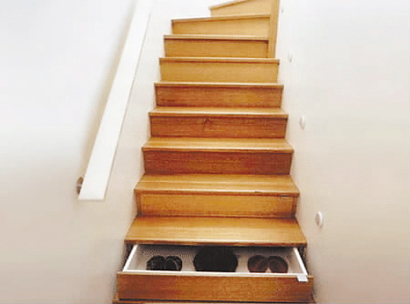 每一级阶梯下都是一个抽屉,也许会让每一步都走得很有内容?这样的设计,意义可不只是节省空间了,想一想,拉开一个抽屉,随意地坐在楼梯上做一件事,是不是一小段安闲的时光?