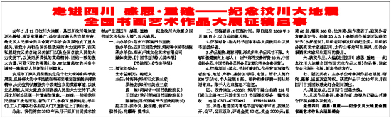 为此,我们将在2010年元月于四川自贡美术馆举办“走进四川 感恩·重建——纪念汶川大地震全国书画艺术作品大展”,以示感恩。