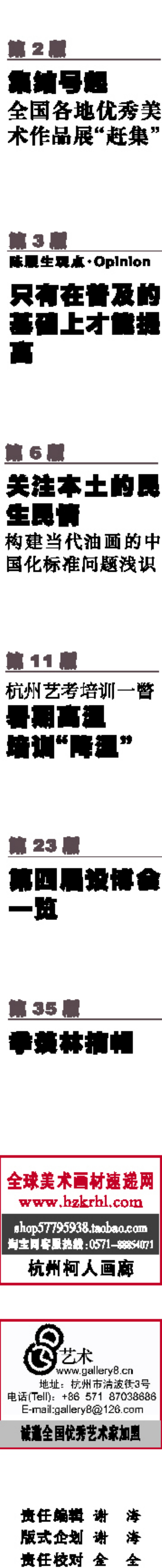本期导读 集结号起 全国各地优秀美术作品展“赶集” 第2版 只有在普及的 基础上才能提高 第3版 陈履生观点·Opinion 关注本土的民生民情 构建当代油画的中国化标准问题浅识 第6版 杭州艺考培训一瞥 暑期高温 培训“降温” 第11版 第四届设博会一览 第23版 季羡林摘帽 第35版 全球美术画材速递网 www.hzkrhl.com shop57795938.taobao.com 淘宝网客服热线:0571-88854071 杭州柯人画廊 诚邀全国优秀艺术家加盟 责任编辑 谢 海 版式企划 谢 海 责任校对 金 全