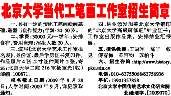 三、填写《北京大学艺术工作室报名表》,身份证、最后学历证书复印件,作品照片4张,2寸证件照片2张,寄达:北京大学二院216室杨重光(收)邮编 100871。