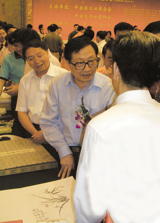 “首届中国文房四宝艺术大师颁证仪式”上,全国人大常委会副委员长华建敏听取艺术大师对于文房四宝技艺的介绍。
