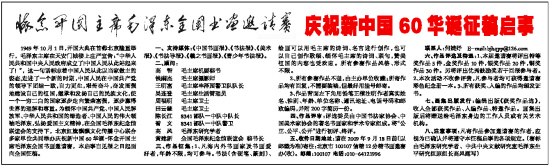 1949年10月1日,开国大典在首都北京隆重举行,毛泽东主席在天安门城楼上庄严宣告:“中华人民共和国中央人民政府成立了!中国人民从此站起来了!”, 这一句话标志着中国人民从此以当家做主的姿态,走进了一个新的时期,中国人民在中国共产党的领导下团结一致,自力更生,艰苦奋斗,奋发图强地建设自己的祖国,继承和发扬自己的民族文化,使一个一穷二白的国家逐步走向繁荣富强,逐步赢得世界的理解和尊重。为缅怀中国共产党、中国人民解放军、中华人民共和国的缔造者、中国人民的伟大领袖毛泽东,弘扬爱国主义精神,在全国毛泽东纪念馆联谊会的支持下,北京红旗飘飘文化传播中心联合多家单位共同举办庆祝新中国60华诞·怀念开国主席毛泽东全国书画邀请赛,本启事自见报之日起面向全国征稿。