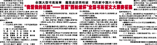 为贯彻落实中共中央办公厅转发《中央宣传部关于围绕庆祝新中国成立60周年深入开展群众性爱国主义教育活动的意见》精神,在全社会大力唱响爱党、爱国、爱社会主义的时代主旋律,新华月报社、中国书画家联谊会、西柏坡纪念馆联合举办“庆祝中华人民共和国成立六十周年‘我爱我的祖国’——‘西柏坡杯’全国书画征文大展赛”,具体事宜通知如下: