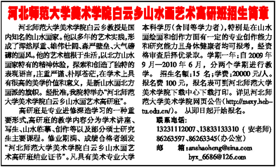 高研班是专业进修深造学习的一种重要形式,高研班的教学内容分为学术讲座、写生、山水临摹、创作等以及部分硕士研究生主要课程。修业期满、成绩合格者颁发“河北师范大学美术学院白云乡山水画艺术高研班结业证书”。凡具有美术专业大学本科学历(含同等学力者),特别是在山水画绘画和创作方面有一定的专业创作能力和研究能力且身体健康者均可报考,经资格审查后择优录取。学期一年:自2009年9月—2010年6月,分两个学期进行教学。 招生名额:15 名;学费:20000元/人。报名费100元,报名表可到河北师范大学美术学院下载中心下载打印。详见河北师范大学美术学院网页公告(http://msxy.hebtu.edu.cn/)。 从即日起开始报名。