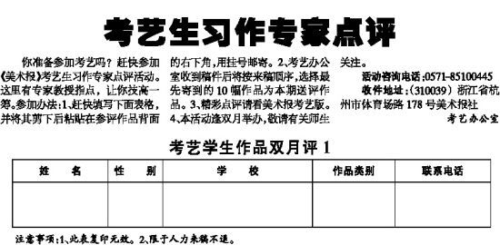 你准备参加考艺吗?赶快参加《美术报》考艺生习作专家点评活动。这里有专家教授指点,让你技高一筹。参加办法:1、赶快填写下面表格,并将其剪下后粘贴在参评作品背面的右下角,用挂号邮寄。2、考艺办公室收到稿件后将按来稿顺序,选择最先寄到的10幅作品为本期送评作品。3、精彩点评请看美术报考艺版。4、本活动逢双月举办,敬请有关师生关注。