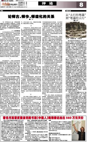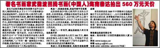 著名书画家武微波形体图腾书画作品《中国人》慈善拍卖会,8月3日下午在海南泰达·美丽道画苑举行。这是《中国人》系列作品第一次以公开拍卖的形式拍卖,最终来自海航集团海航置业的代表以560万元的高价竞得这幅作品,拍卖所得款项全部捐赠给保亭黎族苗族自治县作为文化旅游艺术开发基金,该成交价格也创下了当代书画家作品在海南省拍卖的最高纪录。有着“江北一怪”称号的武微波是中国艺术研究院一级书画师、北京大学研究员。他的作品中“中”字采用夸张的手法将人体骨骼熔入其中;大写的汉字“国”则融合了中华国土的雄鸡图,“人”字的一撇一捺体现出中国人的稳健,民族的振兴,正大步向前走的神韵。