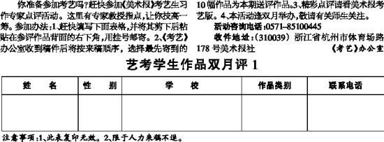 你准备参加考艺吗?赶快参加《美术报》考艺生习作专家点评活动。这里有专家教授指点,让你技高一筹。参加办法:1、赶快填写下面表格,并将其剪下后粘贴在参评作品背面的右下角,用挂号邮寄。2、《考艺》办公室收到稿件后将按来稿顺序,选择最先寄到的10幅作品为本期送评作品。3、精彩点评请看美术报考艺版。4、本活动逢双月举办,敬请有关师生关注。