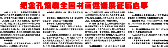 四、待遇:邀请50名优秀作者参加展览开幕式并游览聊城风光(免费食宿、旅游,报销地面来往车票);入展作品均收入《纪念孔繁森全国书画作品集》(暂定书名),颁发入展证书并向国家收藏机构和图书馆赠藏;所有入展作者均可获赠一本书画作品集和高档纪念品;入选作品由孔繁森同志纪念馆永久收藏并颁发收藏证书。