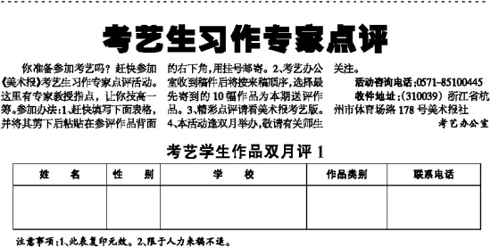 你准备参加考艺吗?赶快参加《美术报》考艺生习作专家点评活动。这里有专家教授指点,让你技高一筹。参加办法:1、赶快填写下面表格,并将其剪下后粘贴在参评作品背面的右下角,用挂号邮寄。2、考艺办公室收到稿件后将按来稿顺序,选择最先寄到的10幅作品为本期送评作品。3、精彩点评请看美术报考艺版。4、本活动逢双月举办,敬请有关师生关注。