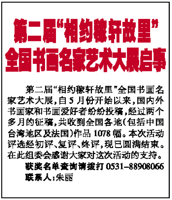 第二届“相约稼轩故里”全国书画名家艺术大展,自5月份开始以来,国内外书画家和书画爱好者纷纷投稿,经过两个多月的征稿,共收到全国各地(包括中国台湾地区及法国)作品1078幅。本次活动评选经初评、复评、终评,现已圆满结束。在此组委会感谢大家对这次活动的支持。