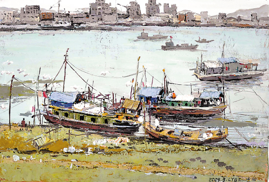 罗永刚(浙江兰溪) 兰溪渔船 水粉画