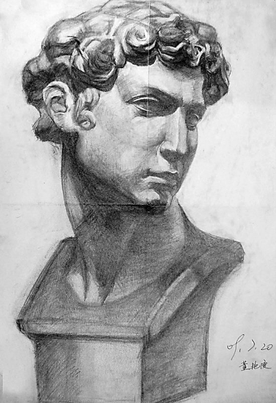 有基本观察形的能力,画得比较完整细致。但观察缺乏整体,小形胜于大形、局部胜于整体。虽然头发和五官画得充分,但整体的面部缺乏大块面的力度,造型上要宁方勿圆。