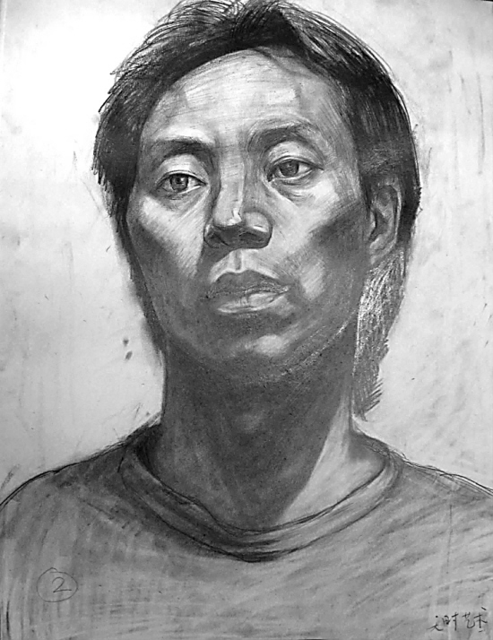 此画形准,体积感强,画得比较结实。如果画得再松动一些,边线——嘴唇、鼻子和面部暗面反光再变化一些、高光不要去描、形再虚一些,会更好。