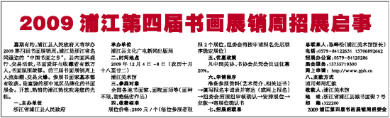 嘉期有约,浦江县人民政府又将举办2009第四届书画展销周。浦江是浙江省名闻遐迩的“中国书画之乡”,县内画风盛行、交易活跃,书画爱好与收藏者有数万人,书画氛围浓郁。前三届书画展销周上人流如潮、交易火爆。参展书画家基本都有收获。是富饶的浙中地区品牌化的书画展会。开放、热情的浦江热忱欢迎您的光临。