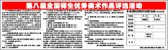 为了贯彻落实全国教育工作会议和《中共中央、国务院关于深化教育改革全面推进素质教育的决定》的精神。在成功举办全国师生优秀美术作品评选活动基础上,在教育部艺术教育委员会、中国教育学会、中国美术家协会、中国书法家协会、全国少工委等有关部门领导的关心、支持和帮助下已成功地举办了七届,受到了教育部及有关部门的高度评价和社会各界的热情关注,已成为我国艺术教育领域中较高规格的活动之一。由中国教育报刊社培训中心主办的第八届全国师生优秀美术作品评选活动现面向全国征稿,评选活动将继续按历届程序进行。具体事宜如下:
