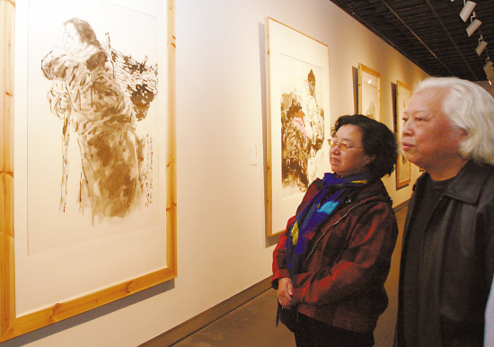 吴山明与夫人高晔参观方增先大展。