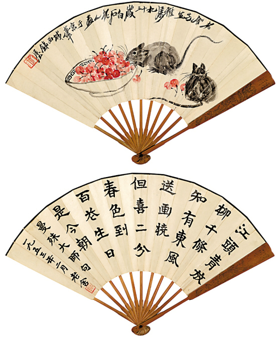 齐白石、老舍 老鼠、书法 设色纸本 成扇