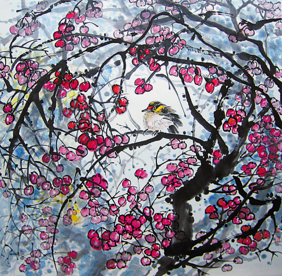 瞿胜兰 红果小鸟 纸本设色 68×69cm