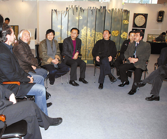 浙江省委常委、宣传部部长黄坤明(右三)、杭州市委常委、宣传部部长翁卫军(右四)在与中外艺术家们交流