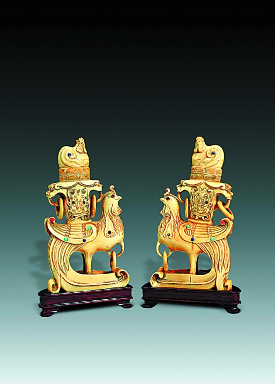 清 象牙雕天鸡驮宝瓶(一对) 14cm.H
