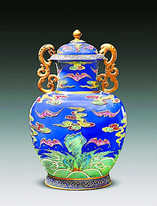 清乾隆 仿掐丝珐琅粉彩寿山福海双龙耳盖瓶