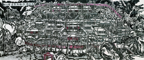 《天台国清讲寺雪霁图》,高220厘米,宽500厘米,己丑仲春永福寺作初稿,画成于灵隐寺藏经楼,十日而成,似有神助,完成之时,藏经楼僧谓余:“画作诞生犹如新生儿,自有命数,与画者无干了。”此图为省重点题材命题而作,现藏于浙江美术馆。