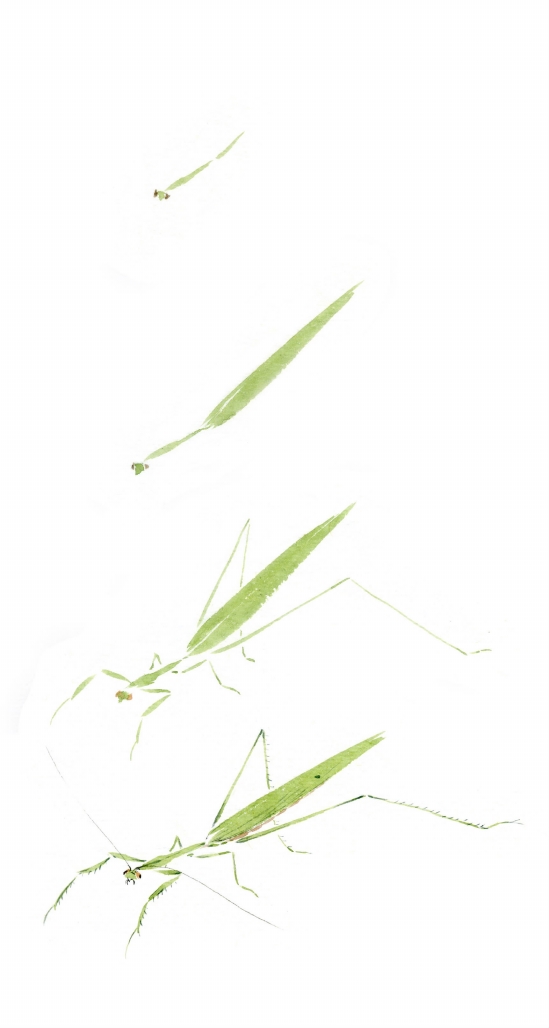 ④以淡胭脂色画出螳螂双翅下露出的腹部、以淡墨勾提螳螂趾足及翅膀上的结构并点睛画触须以完成。
