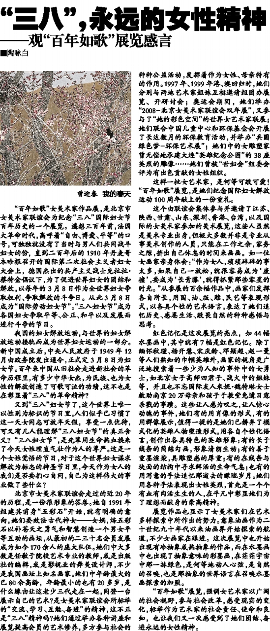 这样一批女艺术家,是何等可敬可爱!“百年如歌”展览,是她们纪念国际妇女解放运动100周年献上的一份重礼。