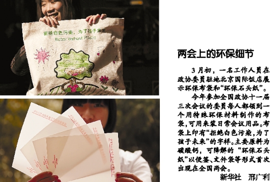 今年参加全国政协十一届三次会议的委员每人都领到一个用特殊环保材料制作的布袋,可用来装日常会议用品。布袋上印有“拒绝白色污染,为了孩子未来”的字样。主要原料为碳酸钙,可降解的“环保石头纸”以便签、文件袋等形式首次出现在全国两会。